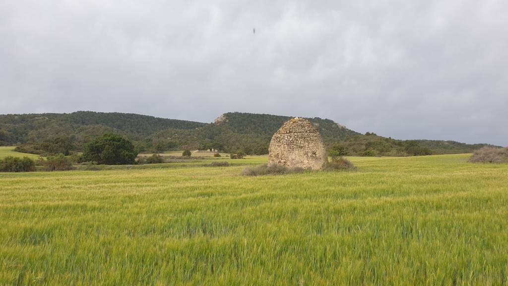A la altura de la caseta oval, (construcción muy curiosa que tenía como finalidad refugio para guardar lo que antaño se cultivaba, hecha de piedra seca abovedada y colocada de forma que te proteja de la lluvia, con salida de humo y escueta entrada muy bien orientada.