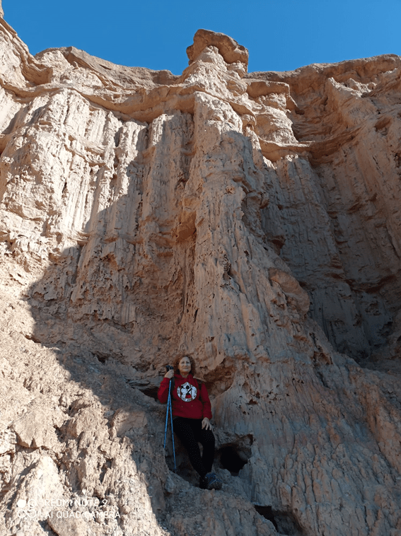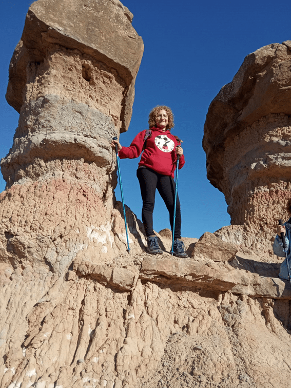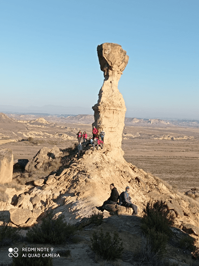 Nuestro primer destino fue el tozal de la Cobeta, partiendo desde la ermita de San Miguel, espectacular por su forma, altura y estrechez. Unos 5 km de ida y vuelta entre senderos no demasiado bien señalizados. Estos tozales se originan por la erosión del agua que va disolviendo las zonas blandas de yesos y margas que se van hundiendo. Si la cobertura superior es de arenisca, más dura, esta superficie permanece, sostenida por los estratos más bajos y es cuando se originan estas pecualiares torres naturales.